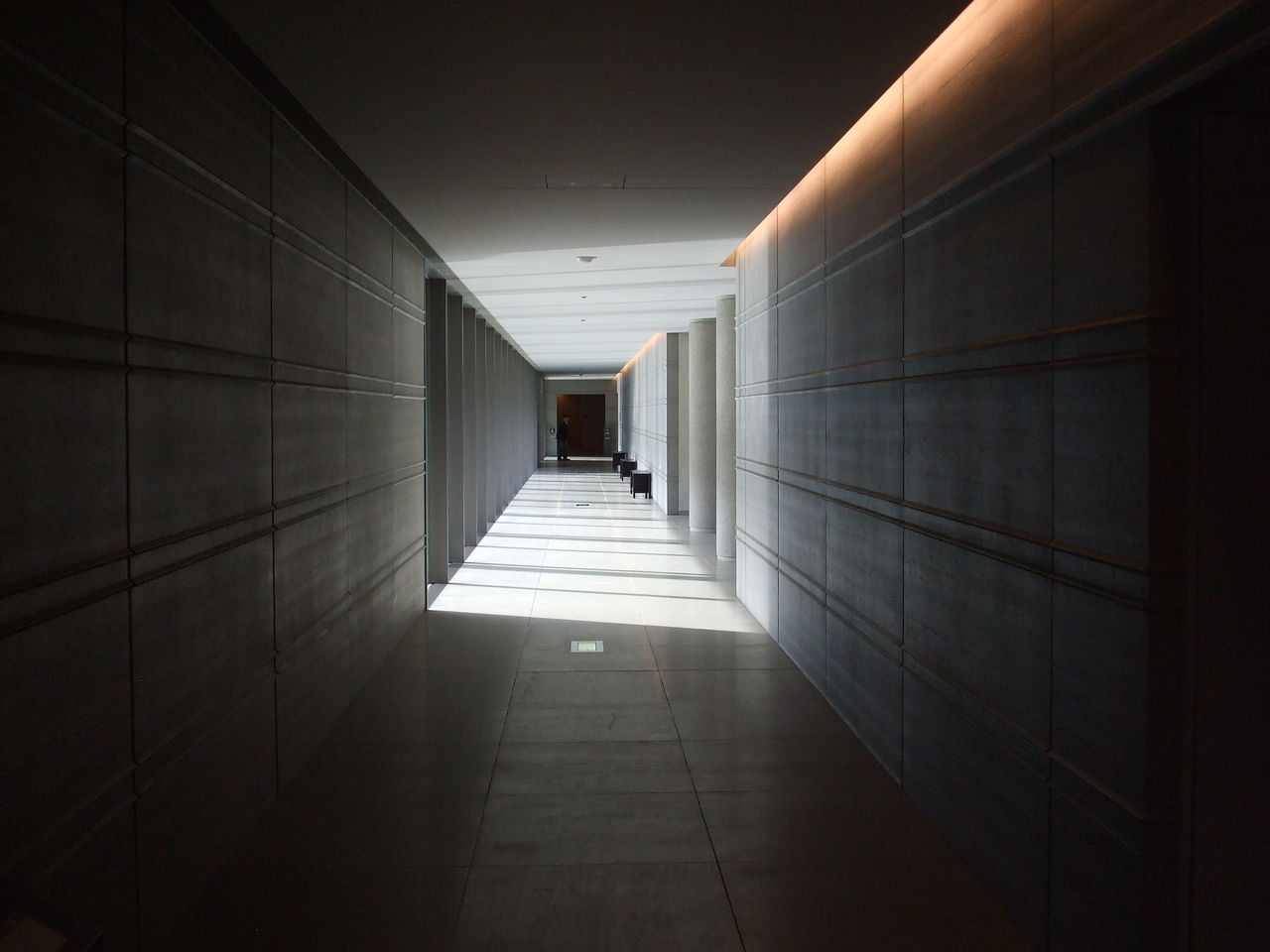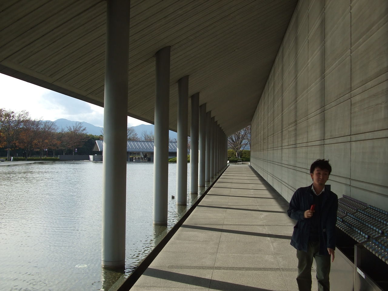 佐川美術館の入り口に向かう列柱の通路は水面に反射する光と列柱の影が織り成す空間が逸る心をさらに高ぶらせる。 佐川美術館にはいたるところにこのような空間の作用を感じられる。設計者の細やかなかつ明確な意図なのであろう。