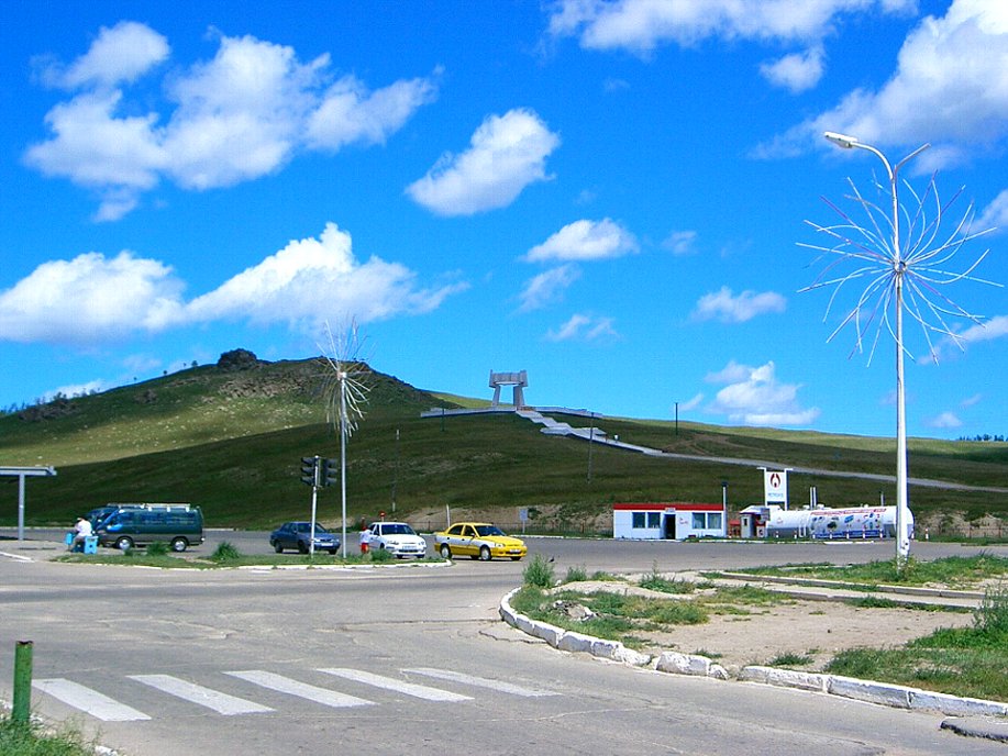 ←モンゴル第三の都市・エルディネット市の丘に立つ銅山発見の記念モニュメント。